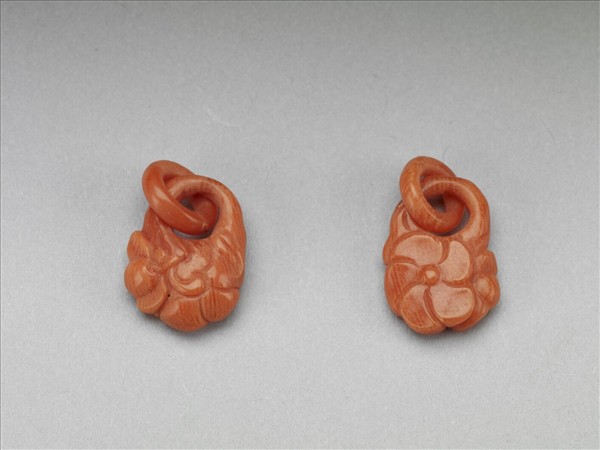 墜角,以珊瑚雕成花藍並扣一環,雕工精巧細緻。故雜6780-故雜6783共儲於一包。