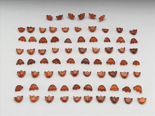 小腰結,以金珀雕成菱角形小飾件,色澤晶瑩,通常製作成服飾的佩件裝飾。本件為圖片中各式金珀腰結的其中一件。故雜6798~故雜6873共七十六件,同儲於一包。
