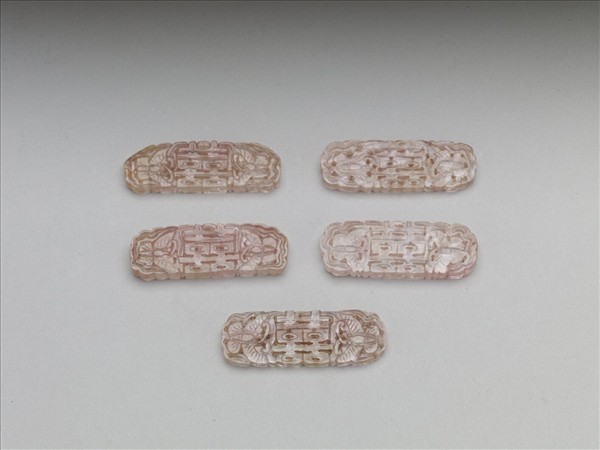 腰結,服飾佩件,以碧璽雕琢成囍字腰結。雙喜字和雙蝶組合成長條形,色澤晶瑩透亮。故雜6895~故雜6899共五件同儲於一包。本件為圖片中各式碧璽囍字腰結的其中一件。
