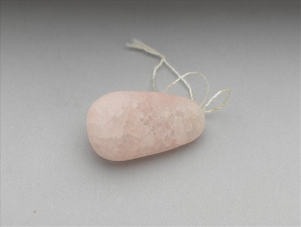 紅碧璽墜飾,穿一小洞以棉繩繫之,色澤粉潤。