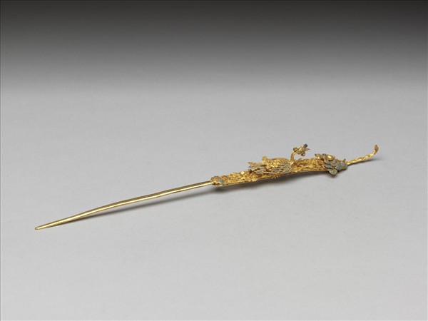 銀鍍金素挺耳挖簪一支,挺扁平而細長,簪首飾纍絲點翠鳳鳥及牡丹,下有一長方形鏤空底座,兩端如意雲紋及廓點翠,內滿飾古錢紋錦地;簪首頂伸出一小段竹節,末端呈勺狀,可作耳挖。嵌件及點翠多脫落。耳挖簪插在髮際,方便隨時拿取,兼具裝飾與實用功能。