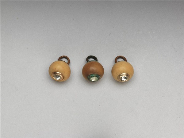 白骨製成鈕扣一顆,通體渾圓、光素無紋。器身有通心穿,一端出銅鉤,一端接圓形銅座,內鑲無色透明玻璃。骨色已變黃,銅質部分有銹蝕 。