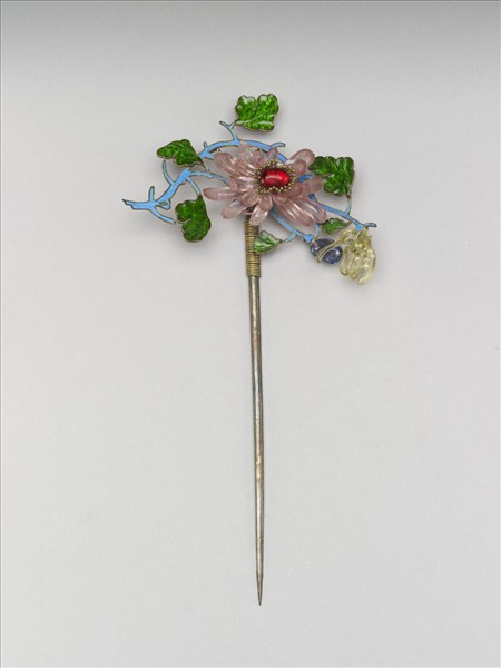 粉紅碧璽花朵,珠翠為花心,紅、藍寶石為蕾;翠玉為葉,花萼點翠。素挺,刻「文呈金」三字。