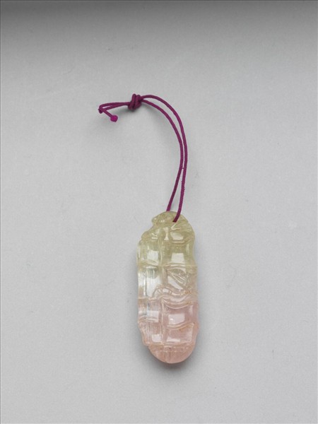 碧璽墜一塊,器身約呈圓柱狀,作竹形,雕出竹葉、竹節與根莖。碧璽帶粉紅、白、黃三色,呈半透明,可見礦石內部天然結晶紋理。黃色一端有穿孔,繫桃紅色絲繩。
