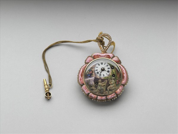 花式懷錶一對(故雜7128、故雜7129),套環、錶殼周邊鑲飾珍珠。錶殼繪飾畫琺瑯玫瑰花葉,錶盤背景繪庭園建築與花木樹石,嵌飾西洋奏樂人物,屬十八世紀晚期至十九世紀上半葉,陸續進入中國市場的花式造型珠錶類型。