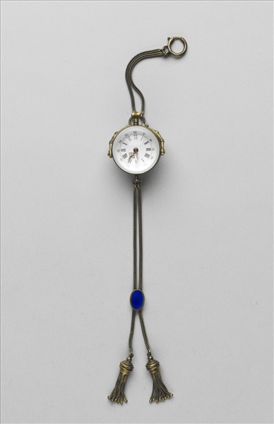 球形錶。銅胎,附銀絲錶鍊,兩面嵌罩透明半球形玻璃,清晰可見錶背機械齒輪與錶盤白底黑字以及合金二針,器側有一銅鍍金柄(鈕),以供上發條。西元1842年瑞士鐘錶藝匠阿德瑞‧菲利普(AdrianPhilippe)製成第一個上弦柄的錶,十數年後(1860)方始比較普及,於是上弦柄(鈕)代替了上弦鑰匙。這對備有上弦柄(鈕)的懷錶,依錶鍊與指針形制,可能是十九世紀後半或二十世紀初瑞士錶廠的產品。故雜7133與故雜7134一對。