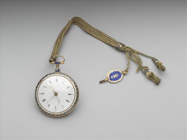 合金質,玻璃蓋周嵌飾一圈西洋畫琺瑯花卉紋,打開透明玻璃蓋後只見琺瑯釉白底黑字錶面,合金三針,固定指針的正中心軸也是上弦處。錶背以畫琺瑯技法彩繪西洋庭園,亮藍透明琺瑯釉為底色,正中一位上罩粉紅衫,下套淺黃裙的西洋婦人,一手執陽傘,一手牽著小西洋小童,後者身穿淺黃色衣褲,右手舉著一鳥;二人回首望著左後方二層噴水池,其右前方有一西洋涼亭。 附合金畫琺瑯匙與金絲線編織之彩穗。