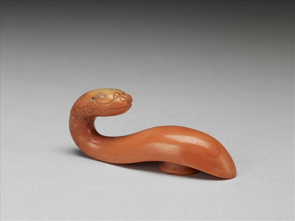 珊瑚帶鉤,琵琶形,鉤作龍首式,背琢橢圓柱。帶鉤是古人扣接腰帶,或配掛鏡囊、印章、刀鞘、錢幣或玉佩等飾品的服飾用具。