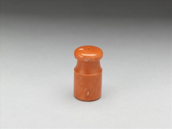 珊瑚煙嘴,全器以一塊長條狀珊瑚琢成,器身一段直筒狀,中空以容納煙管;另一段口沿處琢為圓餅狀,有穿直通筒狀器身,以就口吸煙。全器光素無紋。