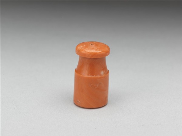 珊瑚煙嘴,全器以一塊長條狀珊瑚琢成,器身一段直筒狀,中空以容納煙管;另一段口沿處琢為圓餅狀,有穿直通筒狀器身,以就口吸煙。全器光素無紋。