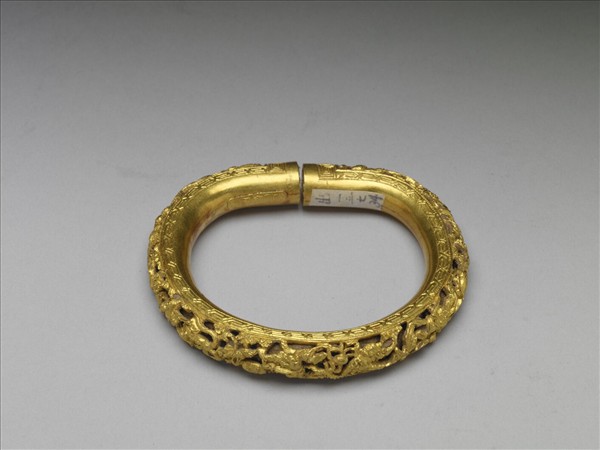 純金金鐲,鏤空雕人物等,鐲中空,內填充茄楠香料泥。鐲內有「合面盛」、「足金」等字。