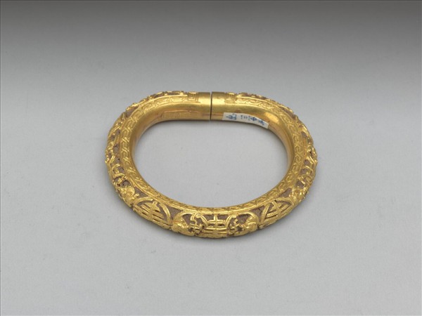 包金手鐲,略呈半圓形,紋作鏤空團壽、長壽及蝙蝠紋,紋飾邊緣回紋一周。鐲中空,填充茄楠木粉。一包金內緣有「合面盛」、「足金」戳記。