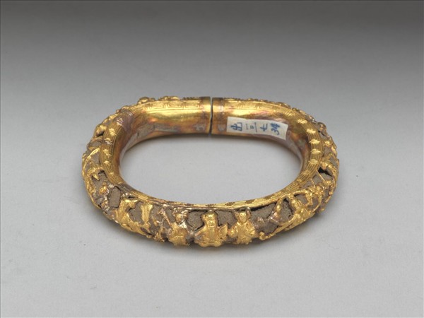 包金手鐲,略呈半圓形,紋作鏤空童叟圖,紋飾邊緣回紋一周。鐲中空,填充茄楠木粉。一包金內緣有「合面盛」、「足金」戳記。