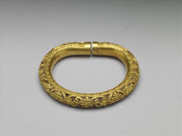 包金手鐲,略呈半圓形,紋作鏤空團壽、長壽及蝙蝠紋,紋飾邊緣回紋一周。鐲中空,填充茄楠木粉。一包金內緣有「合面盛」、「足金」戳記。