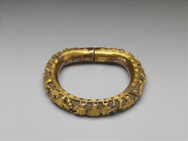 包金手鐲,略呈半圓形,紋作鏤空仙人與八仙圖,紋飾邊緣回紋一周。鐲中空,填充茄楠木粉。一包金內緣有「合面盛」、「足金」戳記。