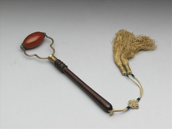 木柄,柄前端接金屬架,尾端串盤長繩結,垂雙流蘇。金屬架固定一顆長棗形紅色蜜臘珠,可以來回滾動。滾子為按摩器具,清代稱之為太平車。