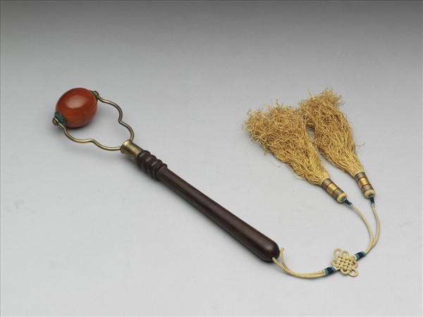 木柄,柄前端接金屬架,尾端串盤長繩結,垂雙流蘇。金屬架固定一顆長棗形紅色蜜臘珠,可以來回滾動。滾子為按摩器具,清代稱之為太平車。