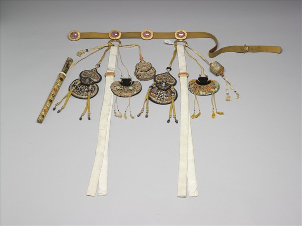 土黃縧,繫金圓板四,上嵌粉紅碧璽。白色長條形佩帉,中段束以金纍絲嵌碧璽橢圓形結。腰帶上繫掛彩繡及壓金、銀絲壽字、梅花、靈芝、水仙花荷包共五,各綴以綠松石及珊瑚珠結。另有金嵌珊瑚、綠松石、紅寶石及藍寶石刀鞘一把。朝帶為清代君臣穿著朝服時所配飾的腰帶。