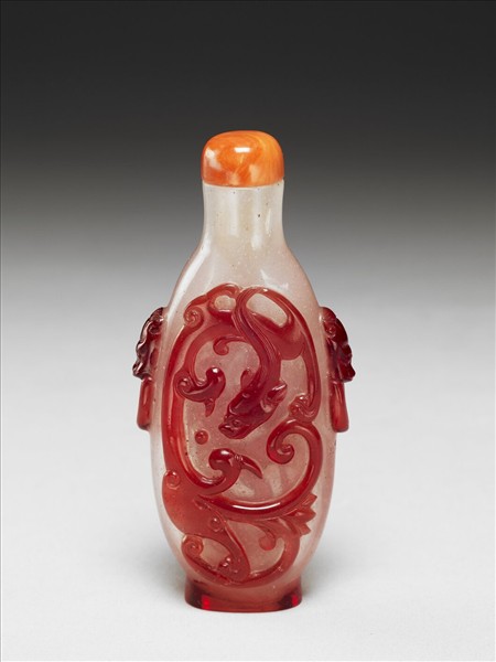 半透明小口斜肩玻璃扁瓶,器腹及器底圈足套深紅玻璃。器身一面於紅玻璃層琢刻身軀卷曲盤繞的螭龍,另面琢銜芝鳳紋。肩部兩側飾淺浮雕獸首銜環。通體色澤紅白對映鮮明。螭龍探首,翔鳳展翅,浮雕生動遒勁。白玻璃胎體內懸浮大小氣泡,猶如冬日天際霏雪,空濛凝凍,故有「霏雪地」之稱。