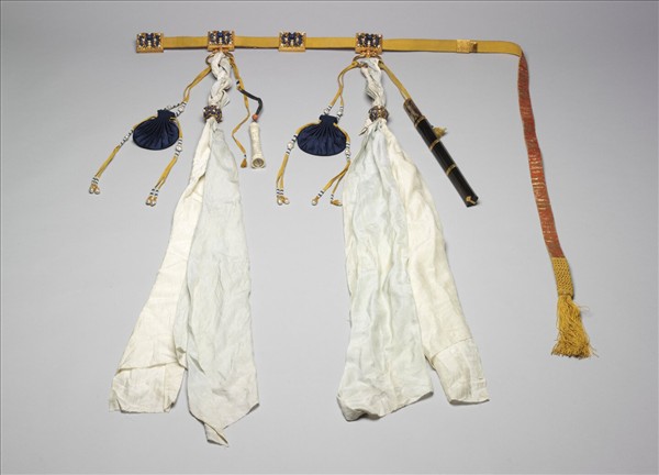方形金帶版四塊,內嵌青金石龍紋,鑲珠八顆,其中二個附掛環,環上除佩淺藍及白色的之外,並繫純青荷包、牛角柄刀及象牙牙籤筒共四件。形下廣而銳, 上束金鑲青金石龍紋圓結,結上嵌珠四顆。象牙籤筒上陰刻龍紋,底附指南針。本院舊帳冊記錄為「聖祖御用腰帶」,同時本件朝帶帶版雕刻的風格及繫環上的象牙籤筒、刀也符合清代初期的樣式。
