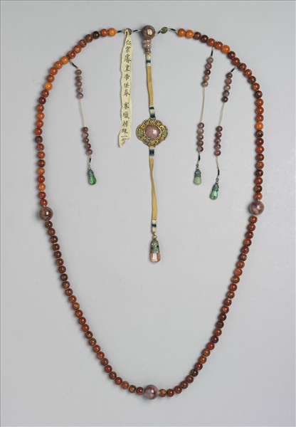 朝珠,計一百零八粒蜜蠟珠,貫以黃色絲線,每隔二十七粒間一碧璽佛頭。三串記捻皆貫碧璽珠十粒,尾端飾以翠玉墜角。首端佛頭飾碧璽佛頭塔一,鍍金點翠鑲粉紅碧璽背雲一,帶玉頂粉紅碧璽墜角一,貫以黃絲長帶。