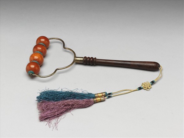 蜜蠟太平車,木柄,柄前端接金屬架,尾端串盤長繩結,垂藍與紫雙流蘇。金屬架固定四顆蜜蠟珠,珠間間扁圓綠松石,可以來回滾動,用作按摩器具,清代稱之為太平車。
