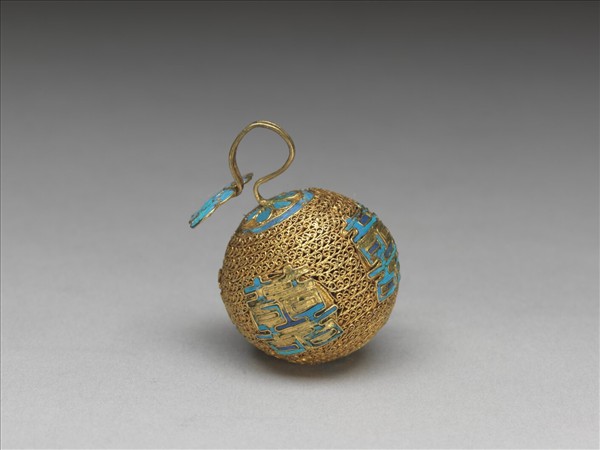 球形鈕子,球頂掛鉤一。通體纍絲,四面飾點翠囍字,頂與底飾點翠六瓣花紋座和如意紋掛鉤。