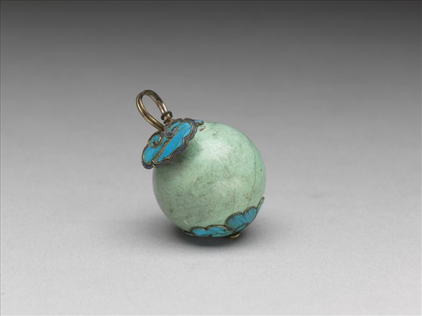 松石鈕子,球形,球頂掛鉤一。頂與底飾點翠牡丹花,鉤上飾點翠如意雲紋。