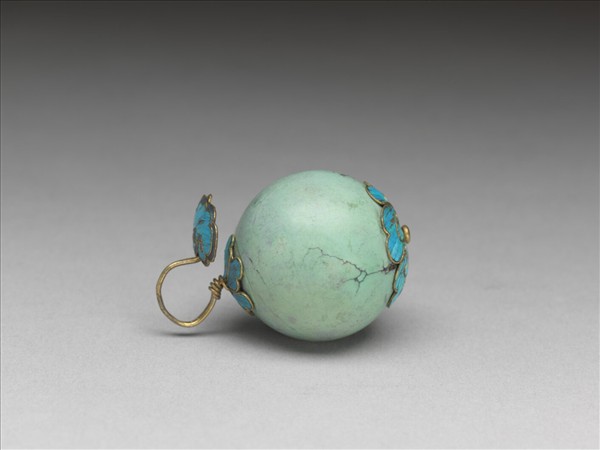 松石鈕子,球形,球頂掛鉤一。頂與底飾點翠牡丹花,鉤上飾點翠如意雲紋。