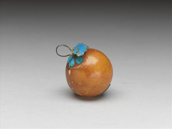 蜜蠟鈕子,球形,球頂掛鉤一。頂與底飾點翠梅花,鉤上飾點翠如意雲紋。