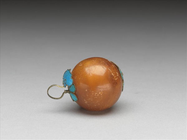 蜜蠟鈕子,球形,球頂掛鉤一。頂與底飾點翠梅花,鉤上飾點翠如意雲紋。