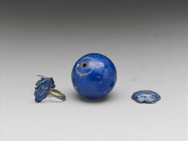 銅胎琺瑯鈕子,球形,球頂掛鉤一。頂與底飾梅花,鉤上飾如意雲紋。