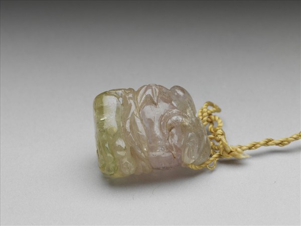 碧璽三多墜飾,雕刻石榴、佛手、桃實,分別代表多子、多福、多壽的「三多」涵義。