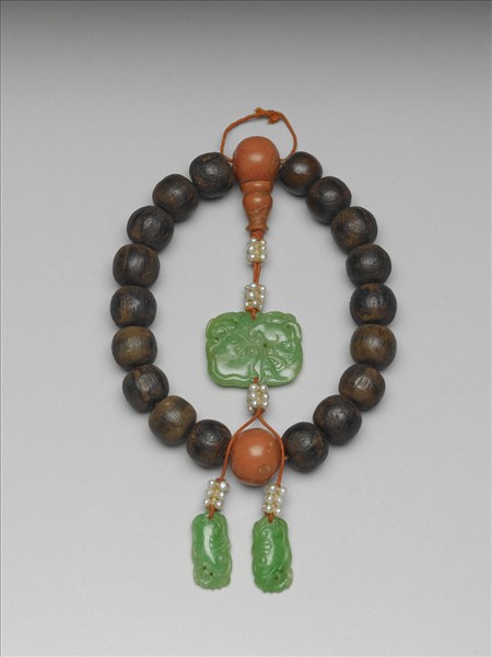 木珠手串,串珊瑚佛頭塔一及佛頭珠二,佛頭塔下綴兩組米珠,下串一翠玉牌,浮雕雙獅如意,上下各穿一組米珠,尾端飾二翠玉墜角,浮雕蝙蝠如意雲紋飾,上方各串有一組米珠。