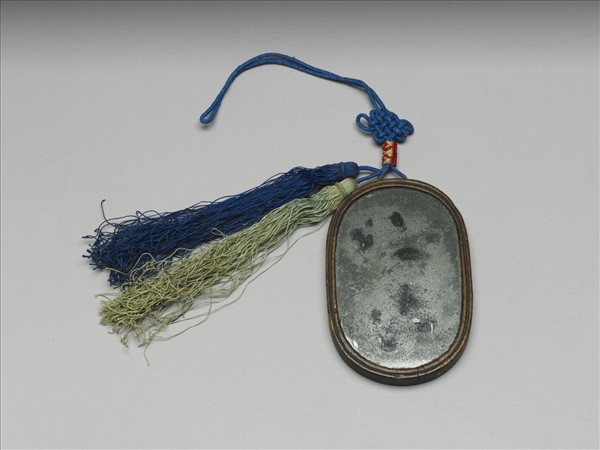 橢圓形玻璃鏡,包鑲於雕壽字木托中。配藍綠色繫帶與盤長結,間以紅白二色卍字縧飾,並繫藍、綠絲穗。