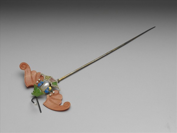 蝙蝠簪,簪首以珍珠、翠玉、珊瑚、碧璽、點翠等拼組成一隻蝙蝠,下接一素挺,尾端尖。