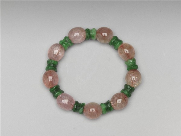 碧璽手串,以粉紅碧璽珠與花形綠玉托各九粒相間串成。此器與故雜7257為一對。