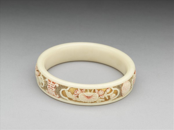 牙白雕花鐲一對(故雜7260~7261),連續卍字紋地四面開光,間以壽字,輪廓邊緣茜染紅色。開光處雕鏤梅、荷、菊、牡丹等四季花卉,並貼飾金箔,意喻花開富貴,四季長春。