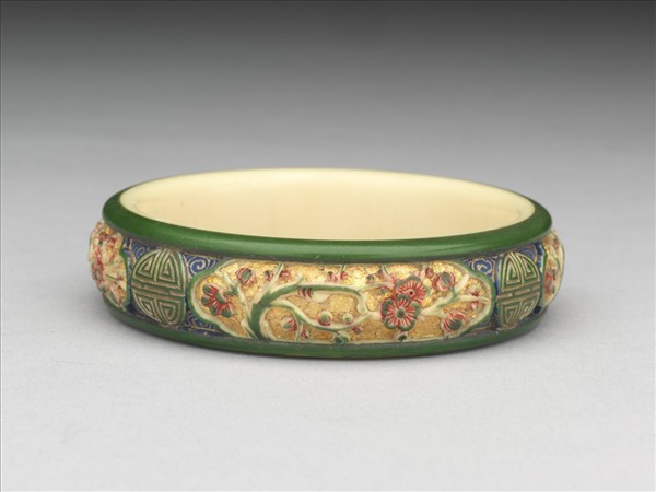 象牙手鐲,鐲面繪藍底描金圓渦紋錦地,浮雕團壽四,間以開光式貼金箔地,其間浮雕梅枝,外部鐲面染綠,開光內花朵部分染紅。此器與故雜7262為一對。