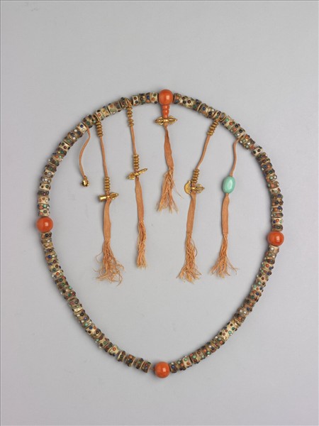 珠:西藏作品;盒:清宮作品。十八世紀。一○八顆人骨珠,有破裂者。每顆上嵌鼓出之金珠、珍珠、青金石、珊瑚、松石、琥珀及五色玻璃各若干粒。珊瑚為佛頭及佛頭塔。三串金珠記捻,繫鈴、杵、月斧為墜腳;另以一松石橢圓珠為記捻,另一記捻已缺。帶紫檀木盒,盒面嵌圭璧形碧玉:其尖首圭上雕三星及福山壽海,璧面雕仿古勾雲紋。