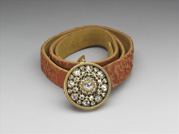 圓形帶頭,將銅鑲鑽石的圓形飾版嵌入銅鍍金托座中,固定於明黃色織帶腰帶上,腰帶內襯紅地織金雲龍紋,應為皇帝御用。鑲鑽飾版為圓形,鑽石呈多面三角形切割,銅座作葉狀,與故雜6295琺瑯鑲鑽梭形結子 的文樣技法相同,應為西洋製品。根據活計檔記載,乾隆年間曾將鐘錶上鑲金剛石拆下做帶頭,這件腰帶帶頭上鑲的圓形鑽石很可能就是西洋製品被整片拆下來運用而成。
