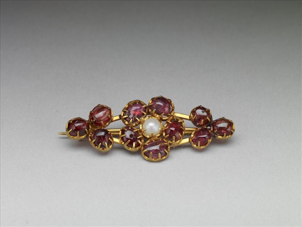 胸針式,金托,各嵌紅寶石十一粒,珍珠一粒。
