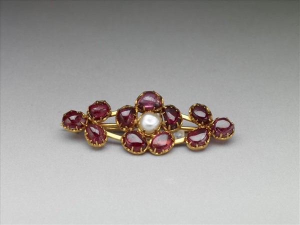胸針式,金托,各嵌紅寶石十一粒,珍珠一粒。
