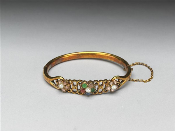 鐲面作扭曲絲紋,上飾花三朵,其二之瓣各嵌粉碧璽五,另一之瓣嵌粉碧璽一、綠玉二、紅、藍寶石各一,每朵花心各嵌珍珠一。有扣環可開闔,有鏈相連。