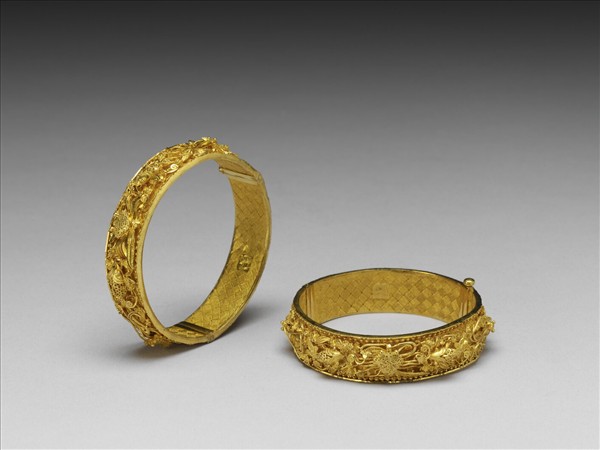 纍絲席紋地鐲面,上飾纍絲魚、蝦、蟹等水族動物,鐲可開闔。內貼一小金片,上鐫「怡益」、「足金」。