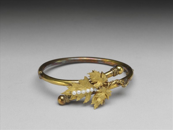 橢圓形,鐲面為葉片三,中嵌珍珠,鐲可開闔,有鏈相連。