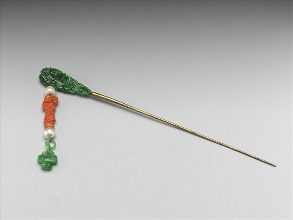 步搖與簪、釵一樣也是插在髮際的飾物,而簪首上垂有旒蘇或墜子,行動時亦步亦搖故稱為步搖。此一步搖,翠玉首鏤雕成水仙、竹葉和桃子,旒蘇部分由二珍珠、珊瑚雕持芝嬰、翡翠環和花籃等組成。碧綠的翡翠與豔紅的珊瑚相映,倍增華麗。