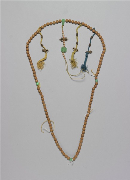 菩提珠計一百零八顆,每二十七顆間一翡翠佛頭,頂端一佛頭塔,下貫紅白米珠、金剛杵、與翡翠團壽背雲,記捻三串,皆串十顆鐵質扁珠與金剛杵為墜腳。