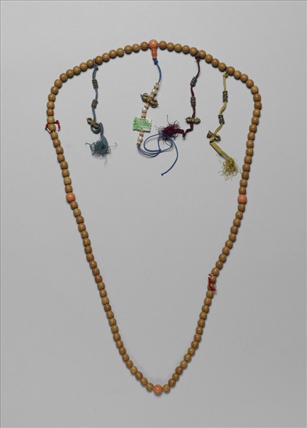 菩提珠計一百零八顆,每二十七顆間一珊瑚佛頭,頂端一佛頭塔,下貫紅白米珠、金剛杵、與綠玉方形背雲,記捻三串,皆串十顆鐵質扁珠與金剛杵為墜腳。