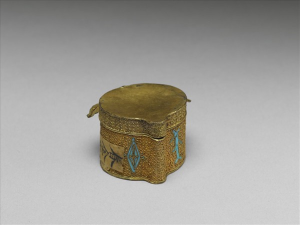 鍍金纍絲盒,桃形,盒壁圓形紋錦地,飾點翠菱形紋與樹幹紋,蓋面無紋,邊上有桃葉兩片。